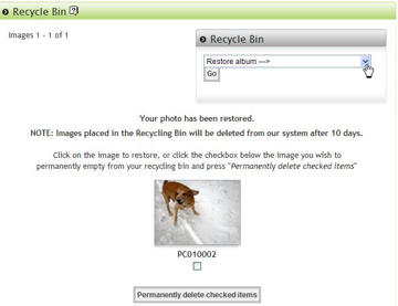 Immediately, an option to “restore album” will appear in the option box located on top of your screen. You can then scroll down and select the album you would like to be restored. Select “go” and “restore”.
